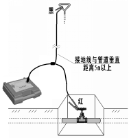 接地钎位置的选择:为保证探测效果,接地钎应与管线距离5m以上,而且黑色接地导线应尽量和管线方向垂直。