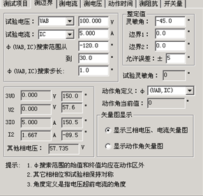 微机继电保护测试仪的测边界作者:合众电气发布时间:2021-08-16浏览量:3868 次字体显示:【大】【中】【小】 微机继电保护测试仪的测边界。 测边界 自动测试出方向性保护的两个动作边界,并且自动计算出最大灵敏角。在“显示动作角矢量图”的显示方式下,从主界面右侧的图中可以很直观地观察到两条边界线和最大灵敏线。上一篇: 微机继电保护测试仪试验参量下一篇: 微机继电保护测试仪测试项目的界面说明