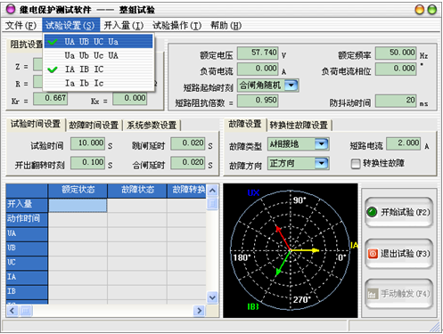 Ua Ub Uc UA:微机继电保护测试仪(键盘版)使用Ua、Ub、Uc、UA(输出UX)进行电压输出,当使用六相电压的测试仪时,选择该选项才有效。