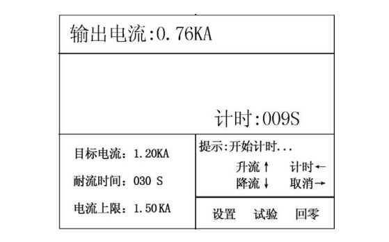 按上,输出电流将不断上升,松开就停止升流,如果到上限就提示满量程;按下↓,输出电流将不断下降,松开就停止降流,如果到下限就提示已回零;按计时一,计时开始工作,到耐流时间计时结束完成试验;