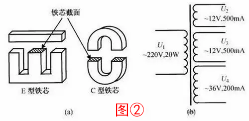 3、电源变压器是最常用的一类变压器。电源变压器的主要参数是功率和次级电压、电流。功率与铁芯截面的平方成正比,如图②(a)所示,铁芯截面越大,变压器功率越大。电源变压器的用途是电源电压变换,并可同时提供多种电源电压,以适应电子电路的需要,如图②(b)所示。制作时应根据需要选用具有符合要求的次级电压、电流的变压器。