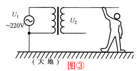 4、电源变压器的另一用途是电源隔离。由于变压器的隔离作用,即使人体接触到电压U2,也不会与交流220V市电构成回路,保证了人身安全(图③)。这就是维修热底板家电时必须要用电源隔离变压器的道理。