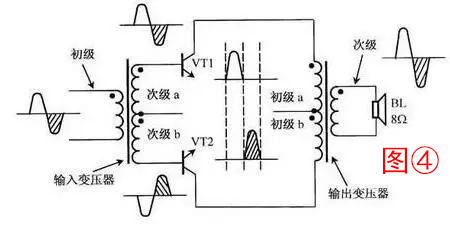 5、音频变压器工作于音频范围,具有信号电压传输、分配和阻抗匹配的作用。图④所示为推挽功率放大器电路,输入变压器将信号电压传输、分配给晶体管VT1和VT2(送给VT2的信号还倒了相),使VT1和VT2交替放大正、负半周信号,然后再由输出变压器将信号合成输出。输出变压器同时还将扬声器的8Ω低阻变换为数百欧姆的高阻,与放大器的输出阻抗相匹配,使得放大器输出的音频功率最大而失真最小。