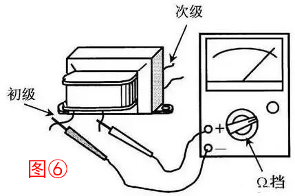 7、变压器可以用万用表进行检测(图⑥)。一是检测绕组线圈通断,二是检测绕组线圈之间的绝缘电阻,三是检测绕组线圈与铁芯之间的绝缘电阻。