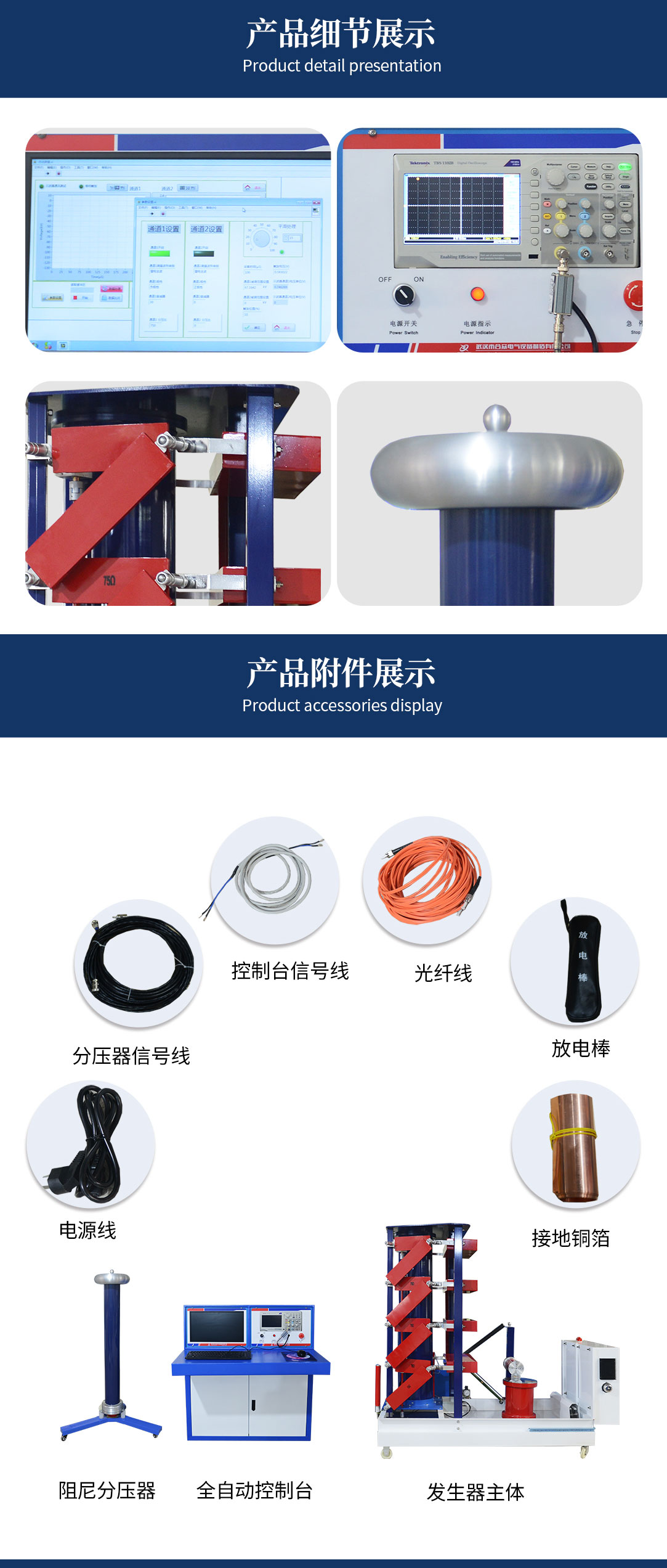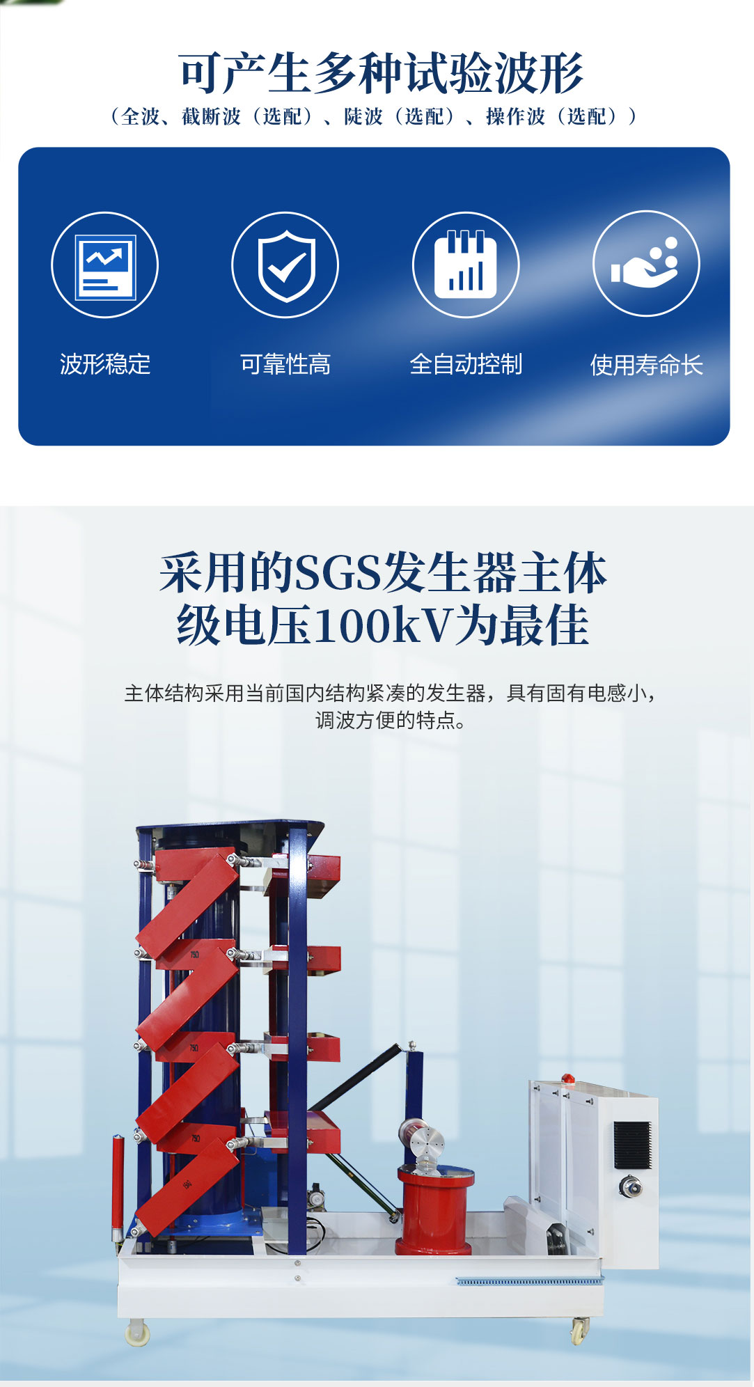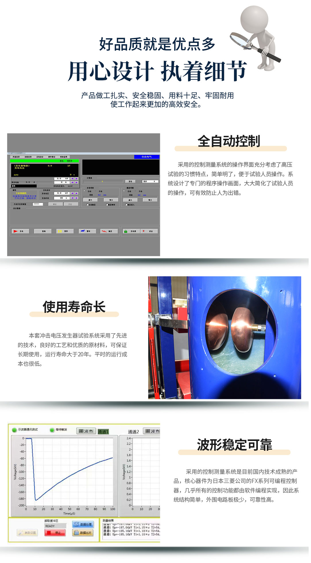适用范围:变压器、户外断路器、互感器、电抗器、避雷针、开关及其它高压电器、高压晶闸管阀SVC(HVDC)、电力电缆、各类高压绝缘子、套管等试品的标准雷电冲击,雷电截断波,操作冲击及用户要求的非标准冲击波的各类冲击电压试验。一套设备就可产生多种试验波形(标准的和非标准的波形,用户提出来的波形)。