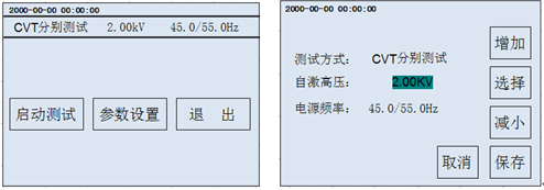 首先根据相应的接线提示接好仪器外部的连线,然后点击主界面“CVT测试”选项,进入下一级CVT测试菜单(如图5-5)。然后可以点击“参数设置”进去设置菜单(如图5-5)进行详细的测试参数设置。分别点击每个需要设置的项目,按“增加”“减小”或“选择”来修改。修改完成后点击“保存”即可保存刚才所修改的参数并返回CVT测试界面,点击“取消”则不保存本次修改并返回CVT测试界面。