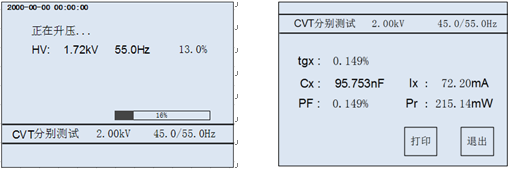 相关参数设置好了后长按“启动测试”单,进入测试菜单(如图5-7)。测试过程中电压值一项是根据先前所选择的测试电压平滑至设置值后保持不变,然后自动开始测试。开始测试后根据先前所选择的干扰频率自动变频到相应的频率进行测试,测试完成后自动显示测试结果(如图5-7)。测试结果自动保存,可点击“打印”按钮打印本次测试结果。