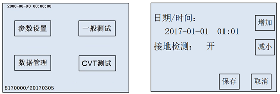 时间设置:打开仪器后直接点击“参数设置”(如图5-11)进入时间设置界面。进入时间菜单(如图5-11)后,点击想要修改的时间数据项目上,然后再按增加、减小键调整相应的“时” 、“分” 、“秒” ,最后点击保存修改时间设置,点击取消退出设置并返回主界面。