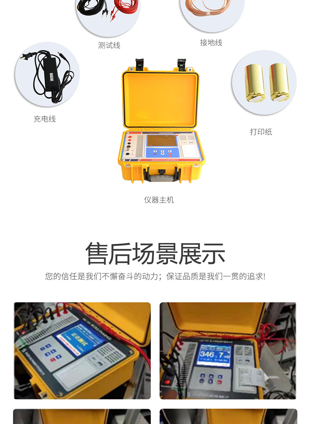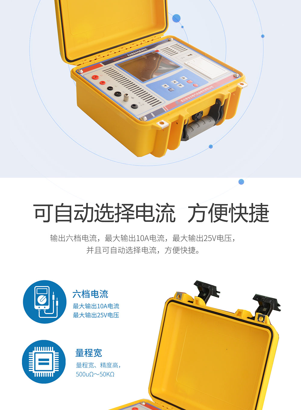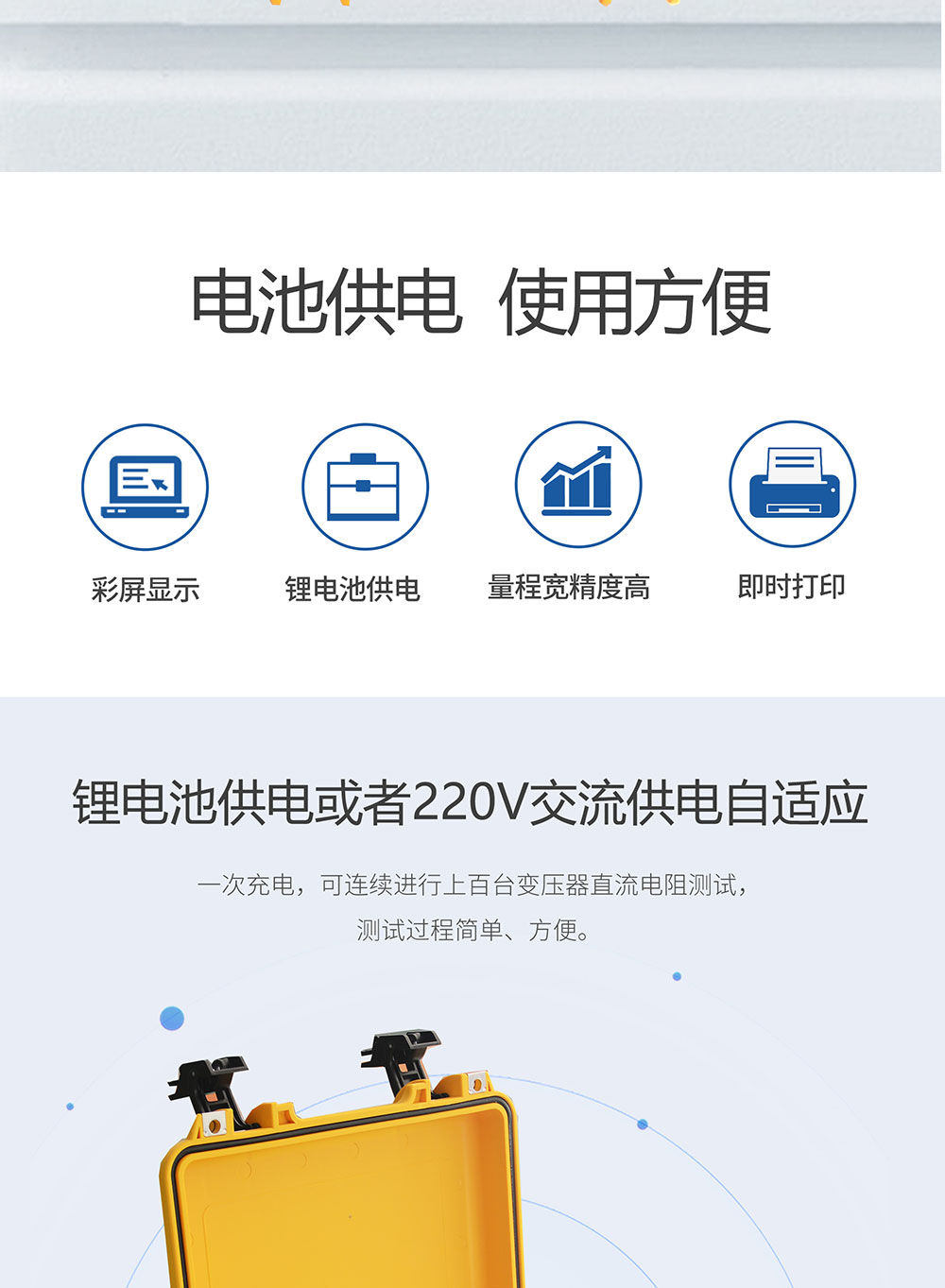 1、锂电池供电或者220V交流供电自适应,一次充电,可连续进行上百台变压器直流电阻测试,测试过程简单、方便。