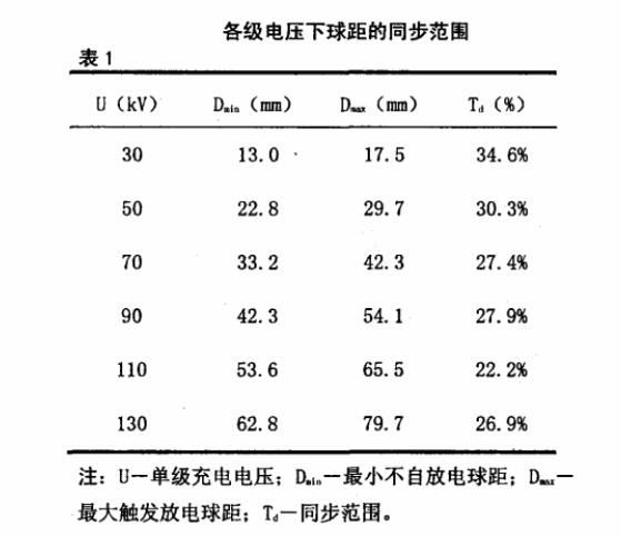 从表1可以看出,冲击电压发生器在各级电压下的同步范围均在20%以上,各级冲击电压下球距均有较好的同步特性,可以满足冲击试验的要求。