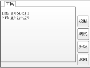 智能互感器测试仪系统工具界面,如图10。在该界面中可以进行时间校对、系统升级等操作。其中:调试用于出厂调试,升级用于软件界面的升级。