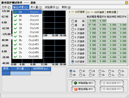 微机继电保护测试仪输出设置和开入量,试验步骤1:输出设置和开入量,试验步骤2:在界面左部选择当前通道输出的谐波类型。