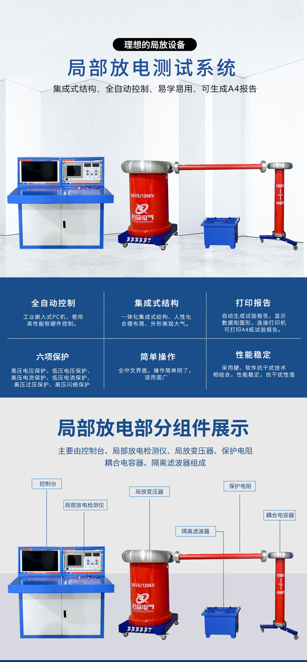 *全自动无局放耐压试验装置,适用于供配电系统,电力变压器制造厂、工矿企业、科研部门等,对各种高压电气设备、电器元件、绝缘材料进行工频或直流高压下的绝缘强度试验,是高压试验中必不可少的重要设备。广泛适用于变压器、互感器、高压开关、氧化锌避雷器、电力电缆等各种高电压电工产品的局部放电的测量,产品的型式试验,绝缘的运行监督等。本仪器检测灵敏度高,试样电容覆盖范围大,适用试品范围广,输入单元(检测阻抗)配备齐全,频带组合多(九种)。仪器经适当定标后能直读放电脉冲的放电量。指针式表头和数字式表头同时显示,指针式表头能按需要方便地选择对数刻度或线性刻度指示。