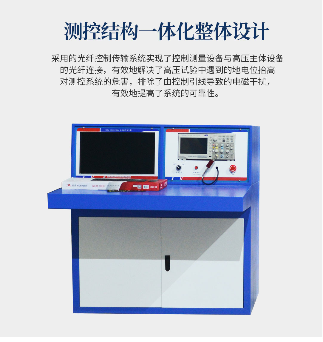 4、采用的光纤控制传输系统在国内高压试验设备中是创新,它实现了控制测量设备与高压主体设备的光纤连接,有效地解决了高压试验中遇到的地电位抬高对测控系统的危害,排除了由控制引线导致的电磁干扰,极大地提高了系统的可靠性。