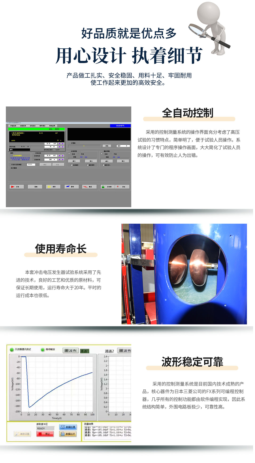 6、本套冲击电压发生器试验系统采用了先进的技术,良好的工艺和优质的原材料,可保证长期使用,运行寿命大于20年。平时的运行成本也很低。