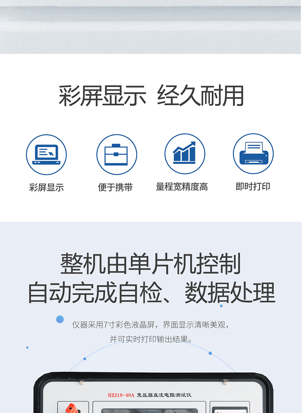 直流电阻的测量是变压器、互感器、电抗器、电磁操作机构等感性线圈制造中半成品、成品出厂试验、安装、交接试验及电力部门预防性试验的必测项目,能有效发现感性线圈的选材、焊接、连接部位松动、缺股、断线等制造缺陷和运行后存在的隐患。为了满足感性线圈直流电阻快速测量的需要,我公司利用自身技术优势研制了直流电阻测试仪。该仪器采用全新电源技术,具有体积小、重量轻、测试量程宽、抗干扰能力强、保护功能完善、大屏彩色液晶显示等特点。整机由单片机控制,自动完成自检、数据处理,具有自动放电和放电指示功能。仪器测试精度高,操作简便,可实现直阻的快速测量。