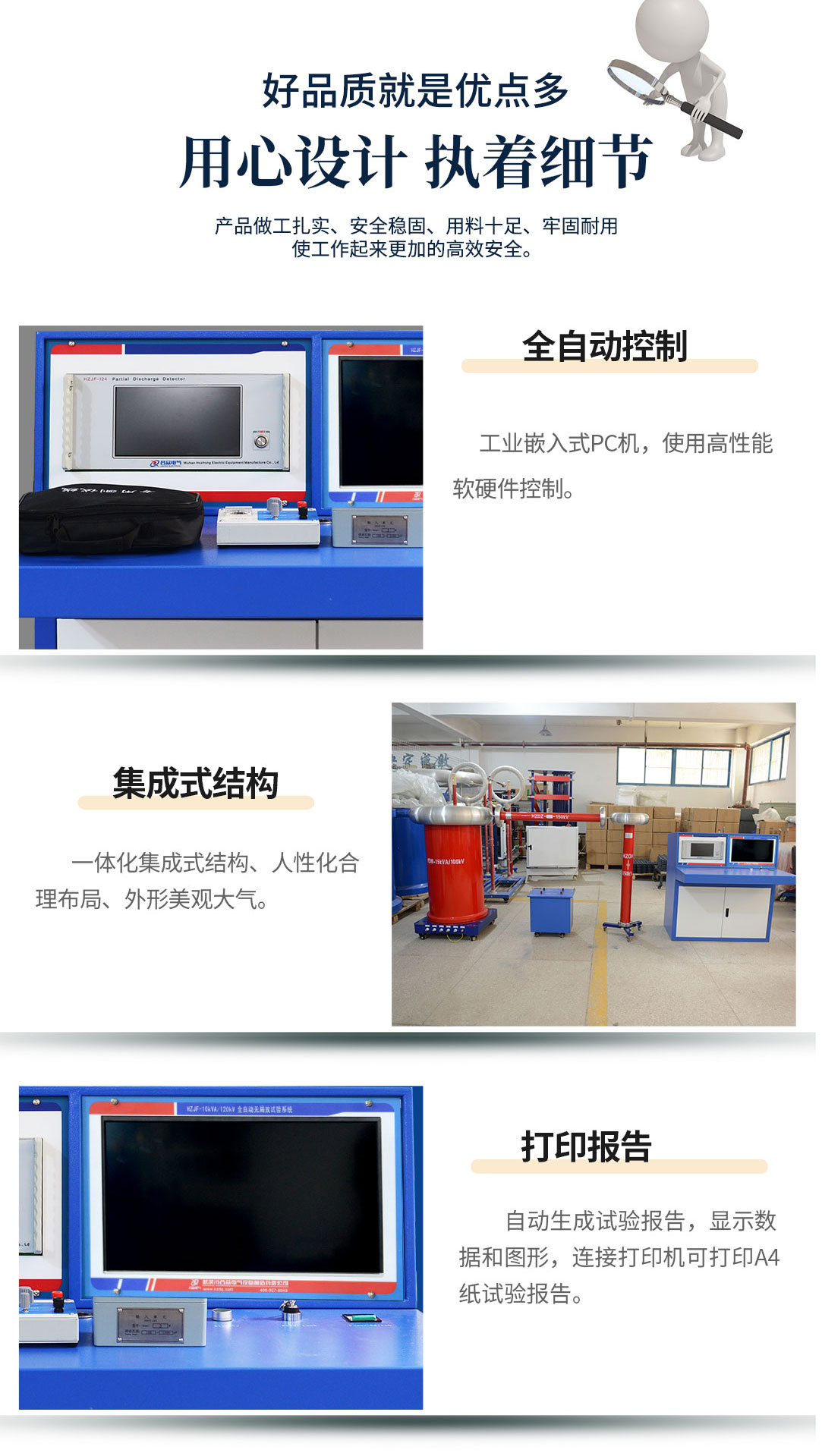 该试验装置适用于供配电系统,电力变压器制造厂、工矿企业、科研部门等,对各种高压电气设备、电器元件、绝缘材料进行工频或直流高压下的绝缘强度试验,是高压试验中不可少的重要设备。巧妙的将无局放试验装置(变压器控制部分)和局部放电检测仪结为一体,外观亮丽轻巧,使测试过程更加方便简单。
