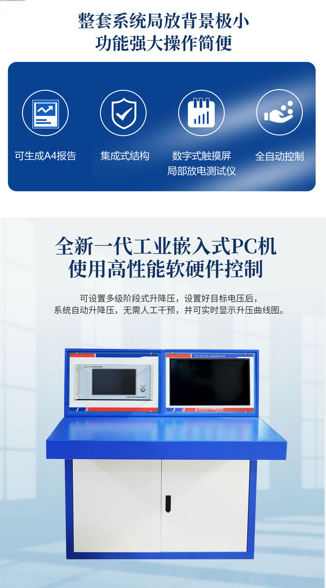 局部放电测试系统 HZJF-124-50kVA/150kV 全自动,适用于供配电系统,电力变压器制造厂、工矿企业、科研部门等,对各种高压电气设备、电器元件、绝缘材料进行工频或直流高压下的绝缘强度试验,是高压试验中必不可少的重要设备。巧妙的将无局放试验装置(变压器控制部分)和局部放电检测仪结为一体,外观亮丽轻巧,使测试过程更加方便简单。
