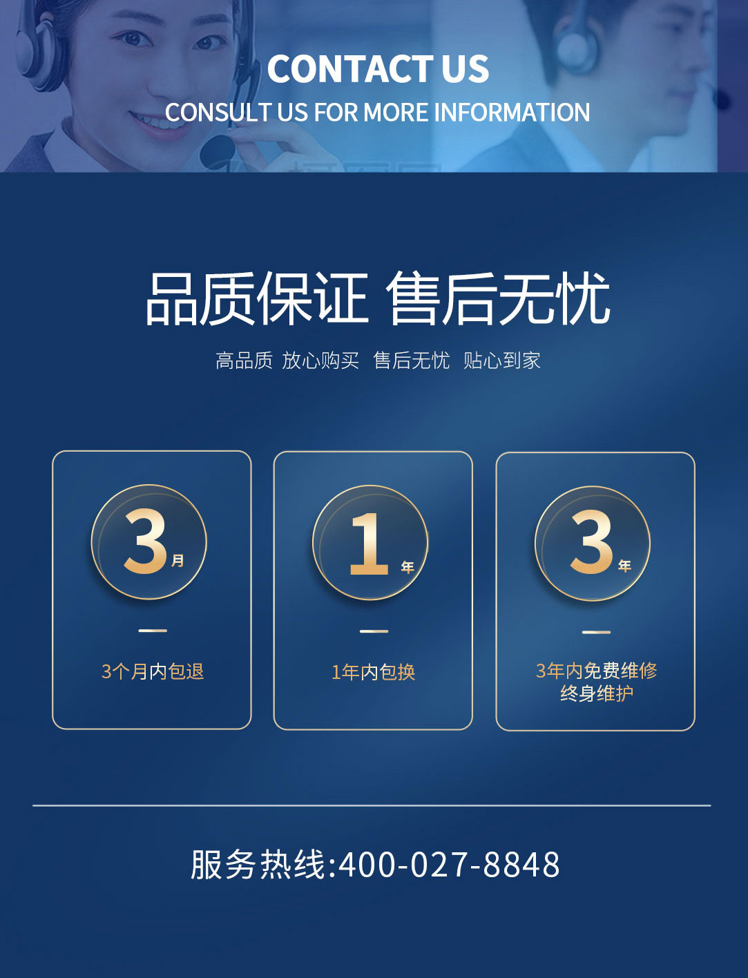 我们的售后服务承诺是:“3个月内包退,1年内包换、3年免费维修,终身维护”。在未来的日子里,我们将一如既往的坚持三类星级服务!