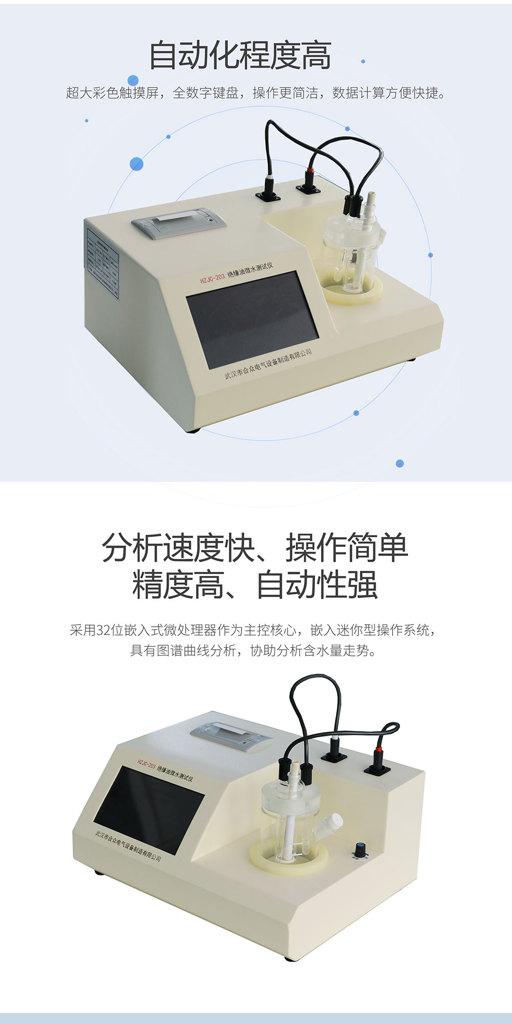 绝缘油微水测试仪,采用卡尔—费休库伦滴定法,对不同物质进行微量水分的测定,是极可靠的方法。微量水分测定仪成功的应用了这一方法,采用了先进的自动控制电路,32位嵌入式微处理器作为主控核心,嵌入迷你型操作系统。从而使该仪器工作更可靠,使用更方便。其分析速度快、操作简单、精度高、自动性强等特点。广泛应用于石油、化工、电力、铁路、农药、医药、环保等部门。