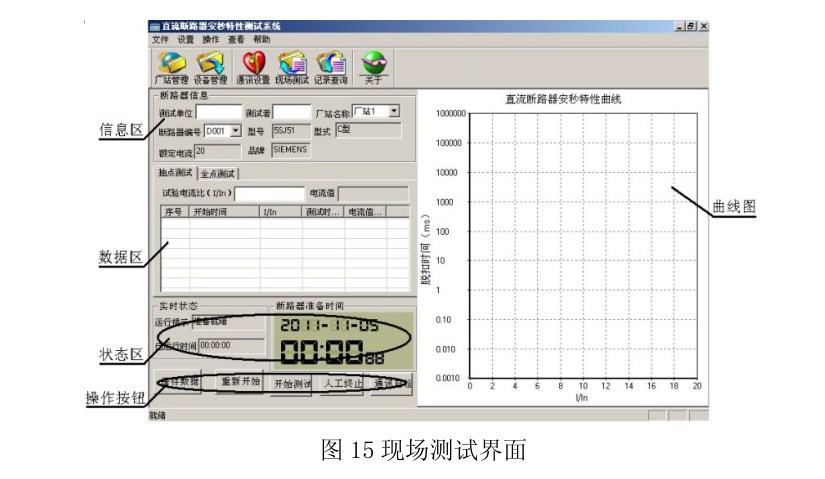 信息区:该区域主要显示被测断路器的基本参数,用户需要填写测试单位和测试人姓名,在“厂站名称”和“断路器编号”选项卡中可以选择已存的所有不同厂家不同型号的断路器。