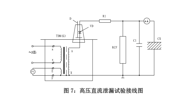 试验变压器在做被试品的直流耐压或泄漏试验时接线原图如图7。