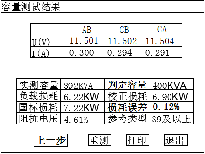 国标损耗:如测得容量归档,则显示所归档位的变压器国标短路(负载)损耗值。